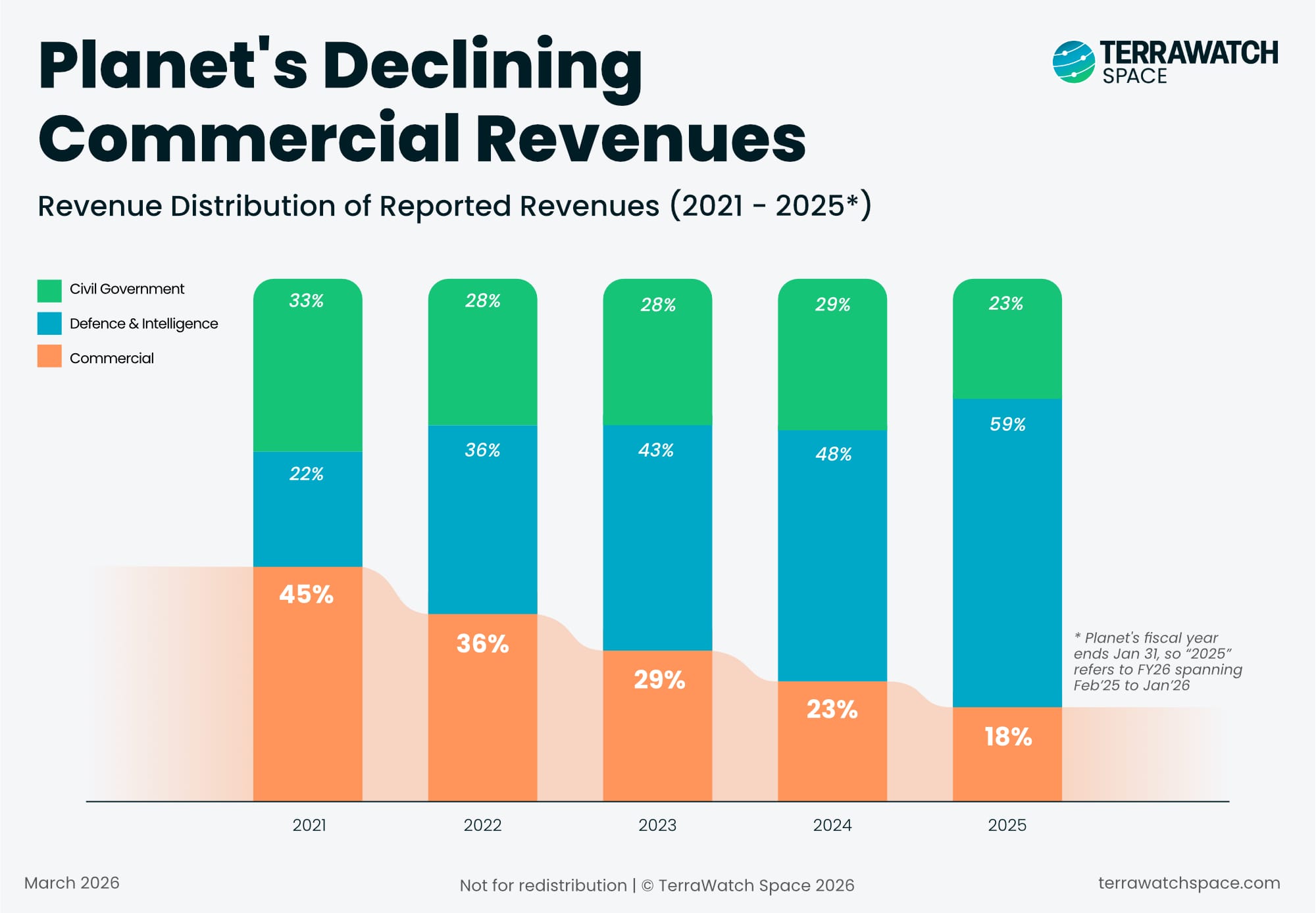 However, as it often does, the reality has proved to be far different: Planet reported its revenues for 2025 last week and it turns out that the share for the commercial segment actually decreased from 45% in 2021 to just 18% in 2026.