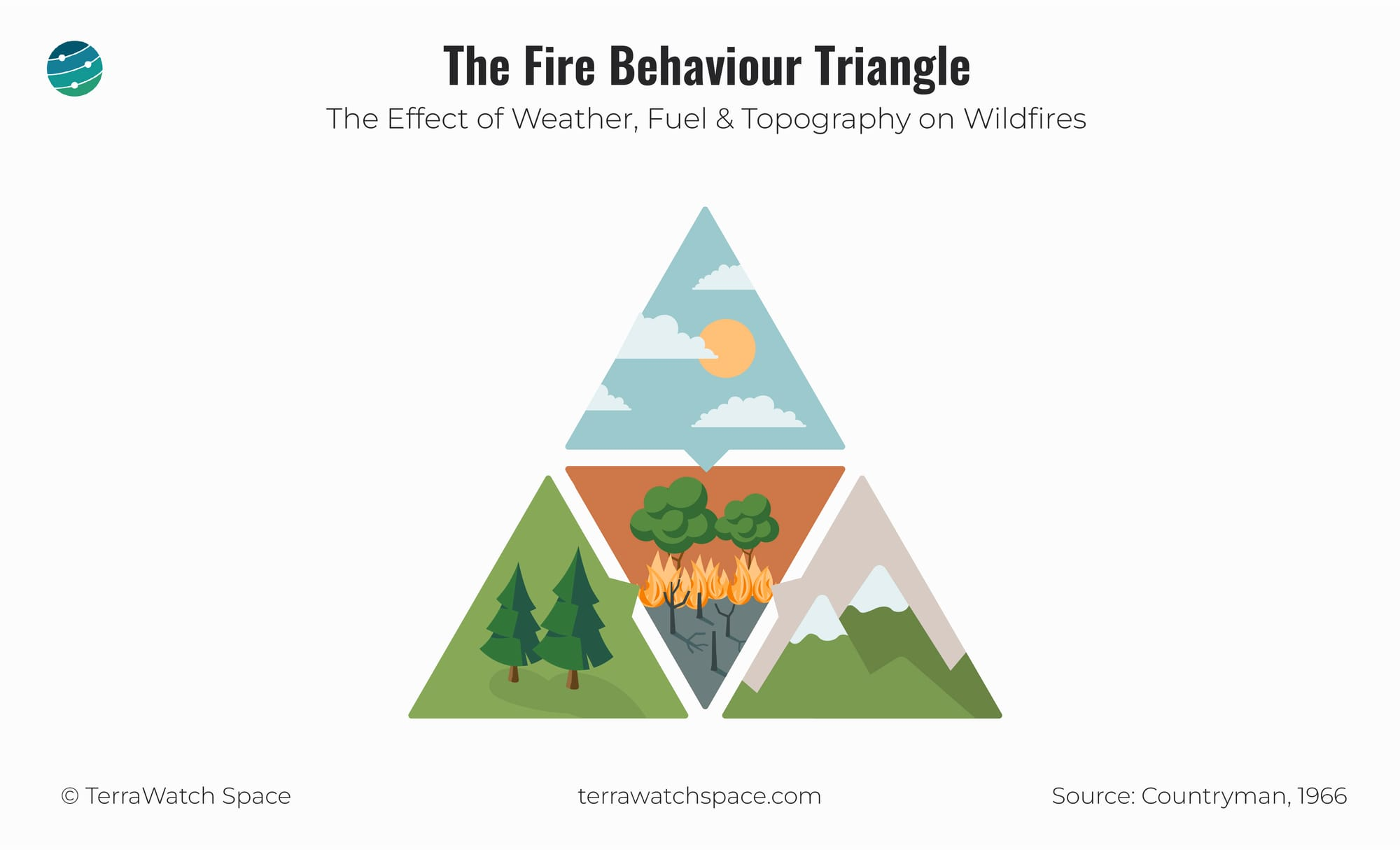 If you are wondering what we really observe, when we say we use EO to "monitor wildfires", the fire behaviour triangle provides a good framework to help identify the key variables that affect how a wildfire behaves.