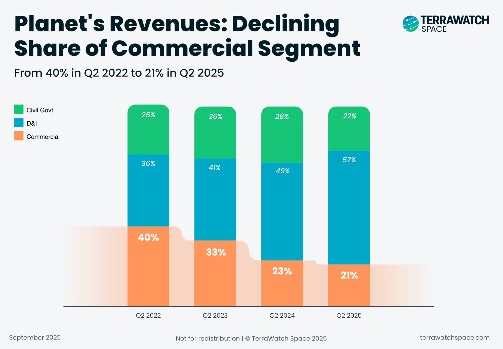 However, the reality has proved to be different: Planet's revenue share for the commercial segment decreased to 33%, according to their Q2 FY 2026 earnings report, down from 40% in Q2 FY 2023 (reported in Sep 2022) to 21% in Q2 FY 2026 (reported in Sep 2025). The visual below shows the share of each segment – note the continuous decline in the commercial segment.