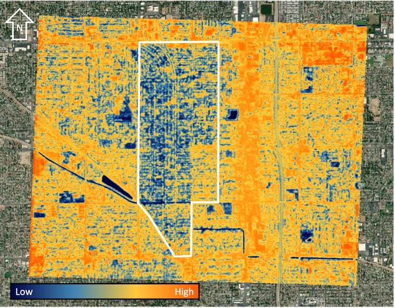 The image clearly shows variations in surface temperature across neighbourhoods in Fresno, with a noticeably cooler area which correlates with a park and wooded district known as Fig Gardens. This indicates the importance of green spaces in mitigating urban heat and hints at socio-economic disparities within different neighbourhoods.