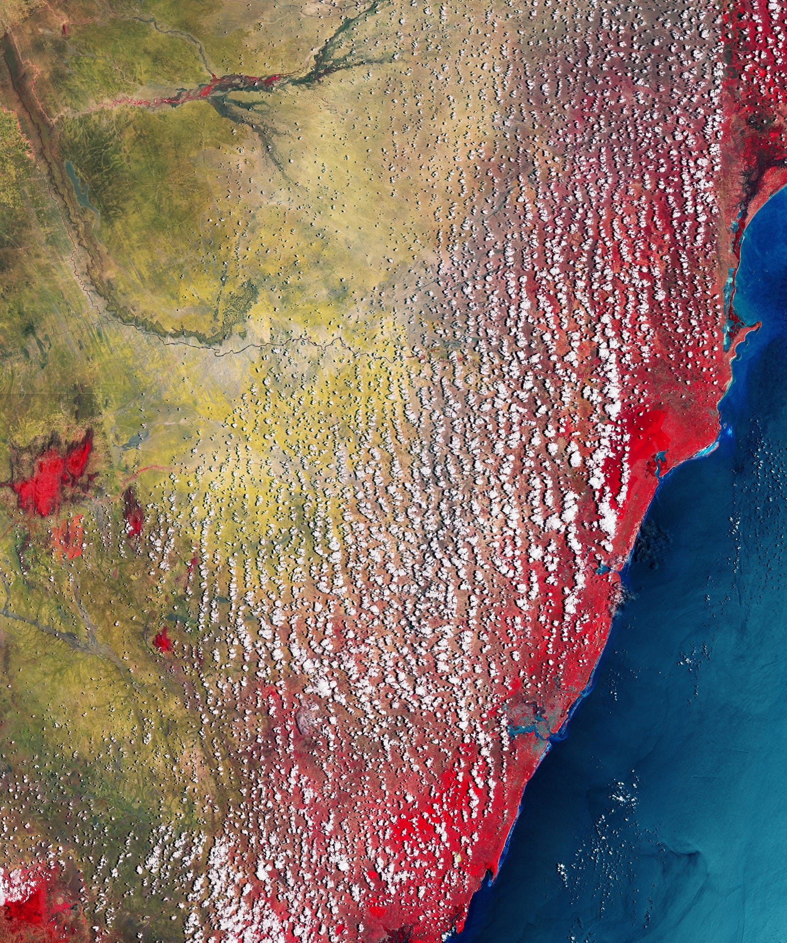 This false-colour satellite image of Southeast Kenya is from the Copernicus Sentinel-2 mission from its near-infrared channel. The red strip of land along the coast denotes heavily vegetated areas, including various natural reserves and parks while the green and yellow areas inland barely have any vegetation.