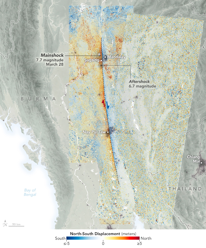 Researchers at NASA’s Jet Propulsion Laboratory used data from Sentinel-1 (SAR) and Sentinel-2 (optical) satellites to visualize how the land moved during the earthquake in Myanmar, which led to over 3,000 casualties and injured several thousands.