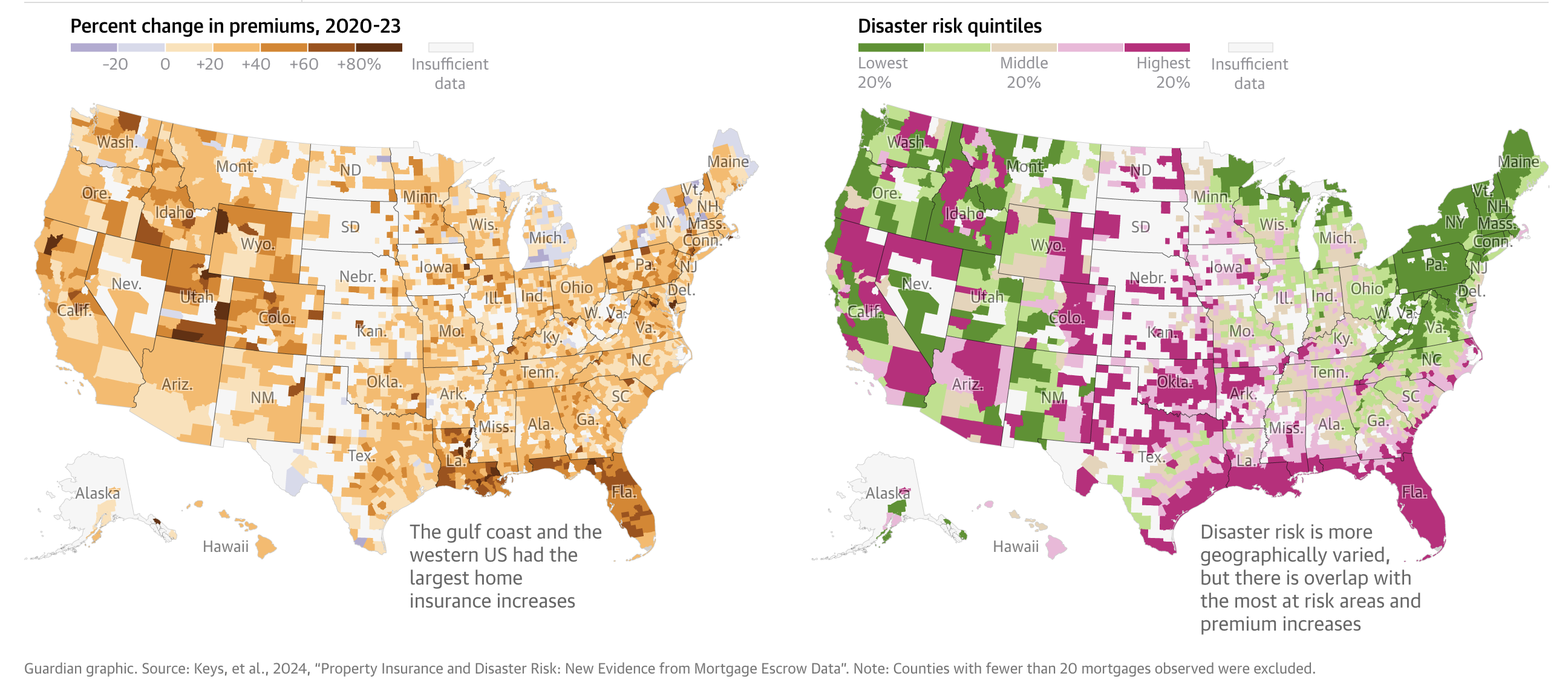 This visual, from the Guardian, based on a recently study, showing how climate risks are driving up insurance premiums around the US - the top counties saw home premiums increase by 22% in just three years.