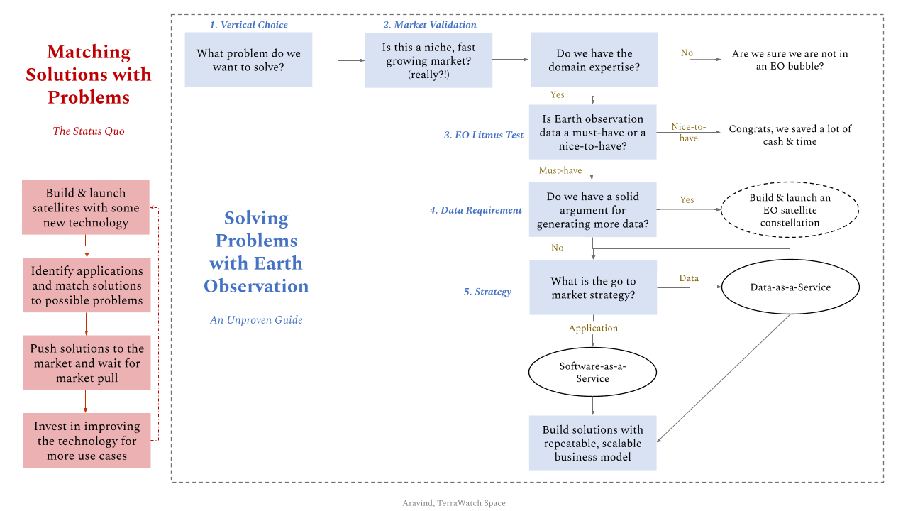 When I wrote this blog- an unproven guide to building a successful EO company - along with this ugly infographic - a few years ago, most EO companies launching satellites followed the model on the left of the figure (technology-driven) more so than the model on the right (problem-driven).