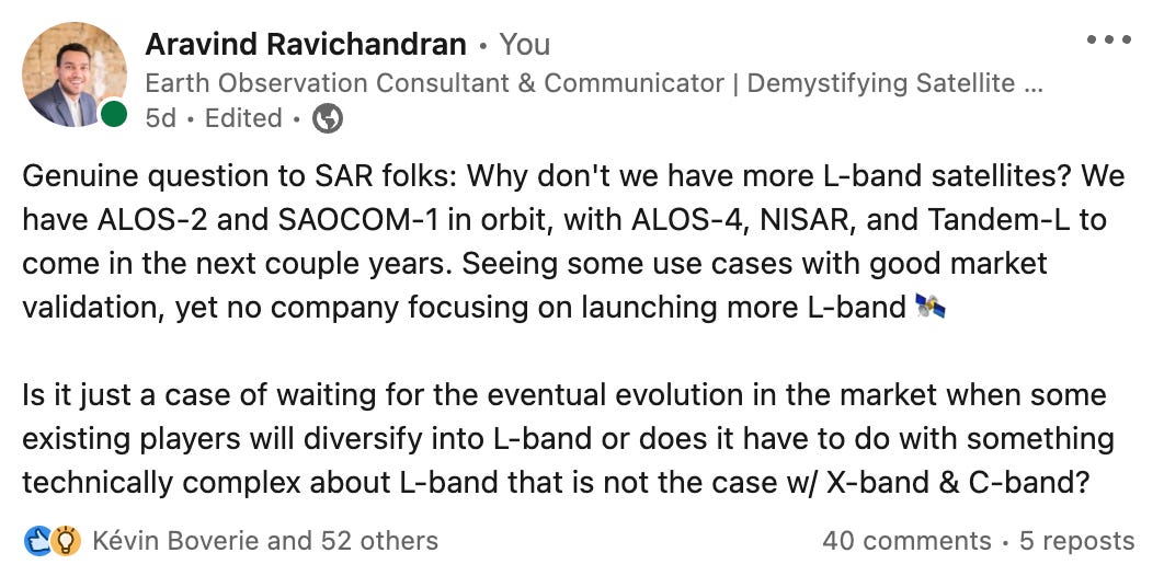 I asked my Twitter and LinkedIn community, out of curiosity, and boy, did they respond. If you want to learn more about L-band SAR, I encourage you to check out the responses on both platforms.