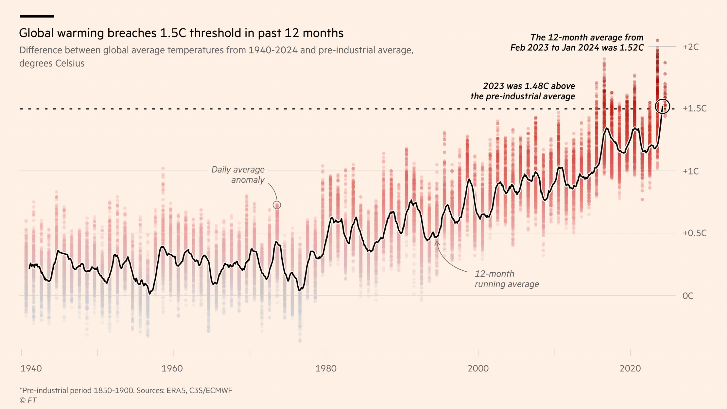 The average global temperature has for the first time breached the critical benchmark of 1.5C above pre-industrial levels over 12 months, according to data from the EU’s Copernicus Climate Change Service.