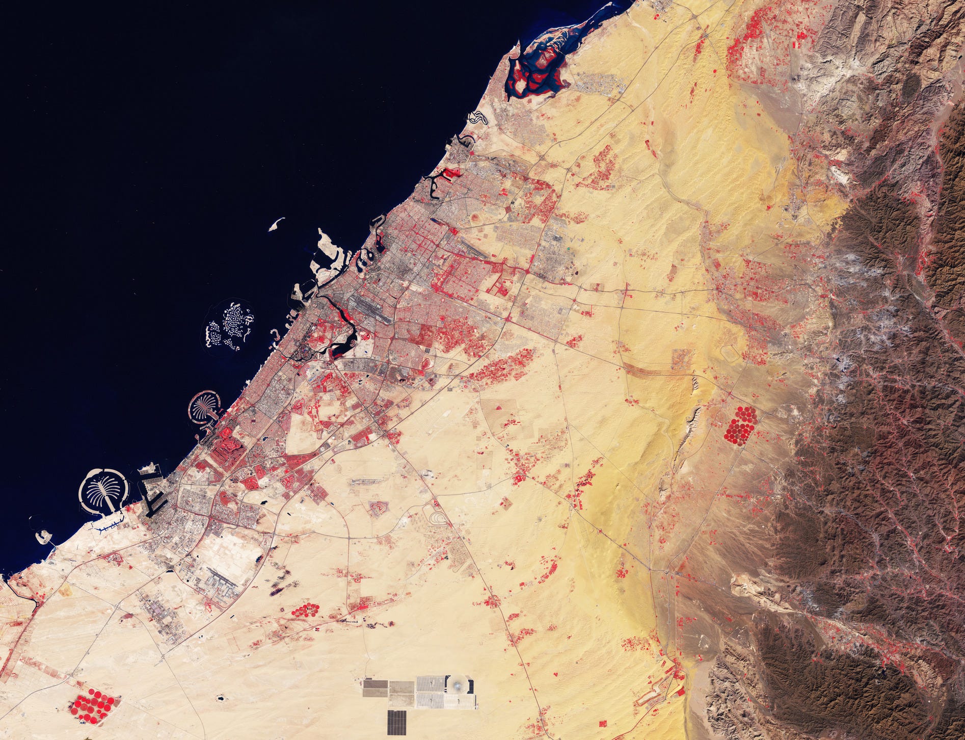 Here is a false-colour image of Dubai acquired by the Sentinel-2’s near-infrared channel, showing vegetation in bright red and water bodies in different shades of blue. The red dots represent golf courses, gardens, parks and agricultural fields, which use centre-pivot irrigation systems that are easy to spot from their circular shape.
