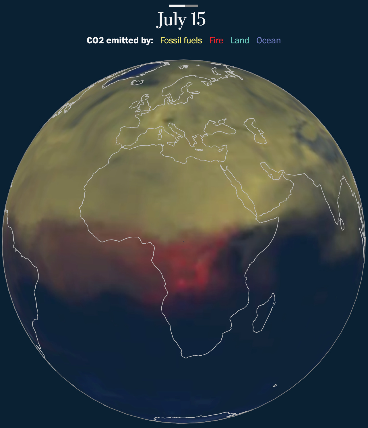 This interactive piece from the Washington Post includes visualisations provided by NASA to show the evolution of CO2 emissions on the planet, segmented by sources. Certainly an interesting way to present greenhouse gas emission data collected by satellites (after validating it scientifically).