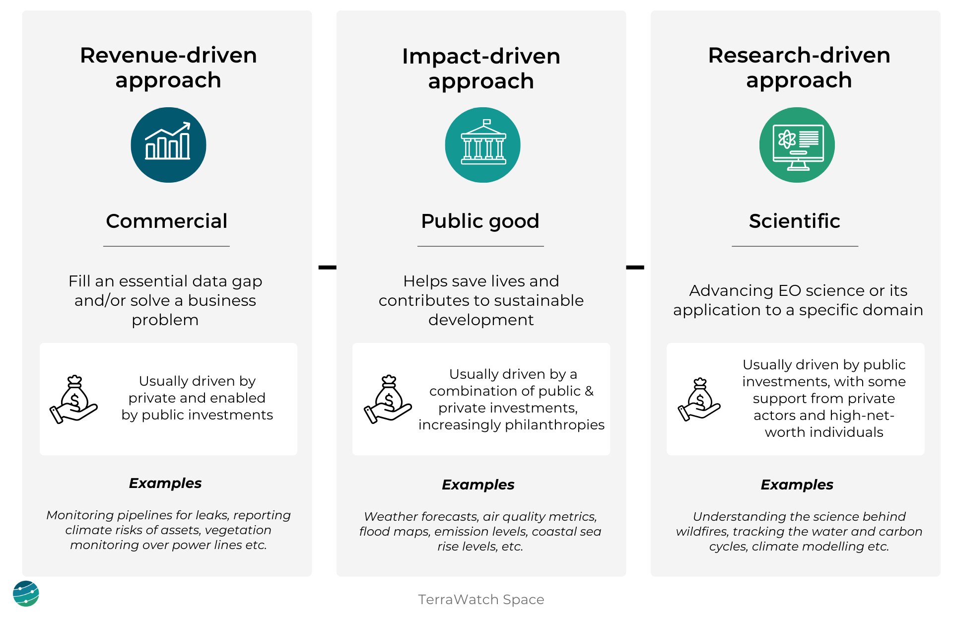 Products that are scientific and research-driven that generally focus on advancing EO or the application of EO in a specific domain - these are usually driven by public investments, with some support from private actors and high-net-worth individuals, predominantly aimed at progressing our understanding of the planet, the biodiversity and our impact on it.