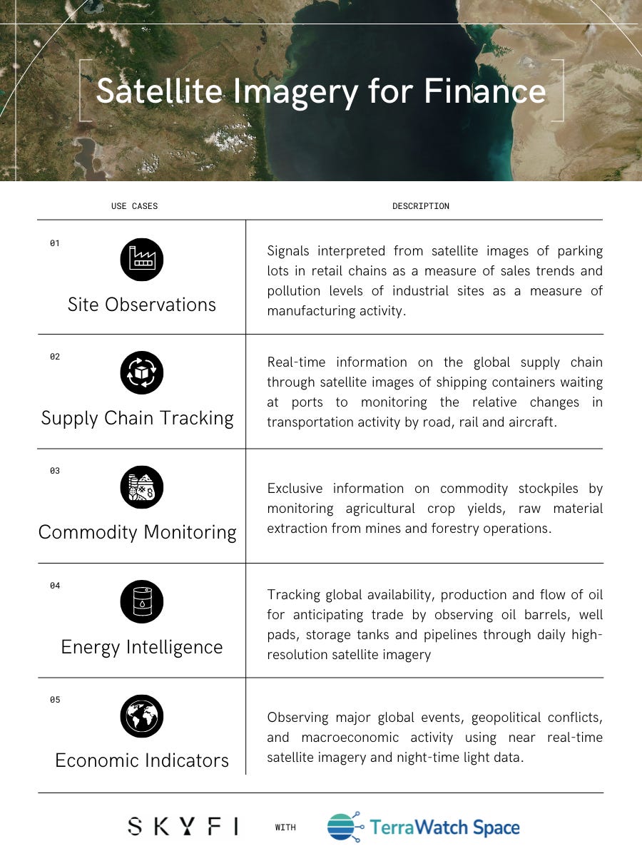 - This article I wrote for EO platform startup SkyFi providing an overview of the applications of satellite imagery for the finance sector (the infographic below covers the highlights).
