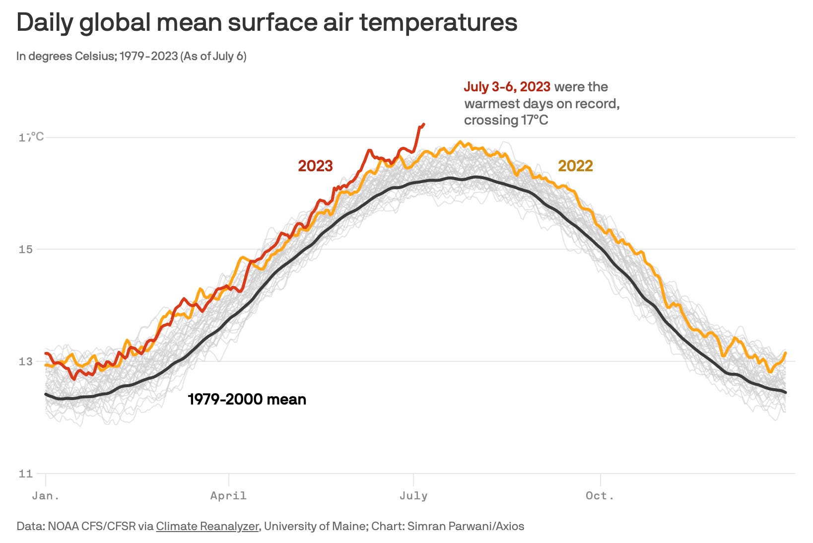 Our planet recorded its hottest day on record last Thursday July 6, making it the fourth straight warmest day globally. Data from NOAA (and ECMWF) showed that the global average temperature was measured to be 17.23°C, which is 1.02°C above the average for the date, and a slight increase from July 5, which already was a record at 17.18°C. This follows the hottest June on record, unprecedented North Atlantic warmth and record low Antarctic sea ice.