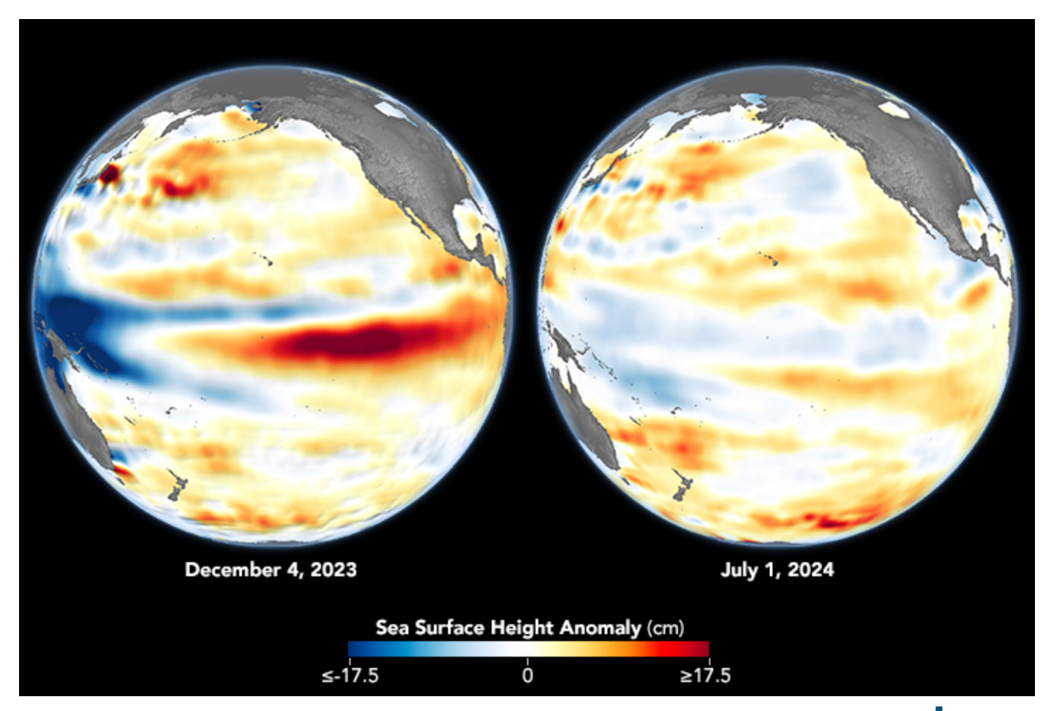 According to NASA, the El Niño phenomenon came to an end in May 2024, as shown through the normalisation of sea surface height across the central and eastern Pacific Ocean, comparing the El Niño phase (December) and neutral phase (July). This phenomenon contributed to record ocean temperatures. These ocean topography measurements were from the Sentinel-6 Michael Freilich, a US-Europe partnership mission, launched in 2021.