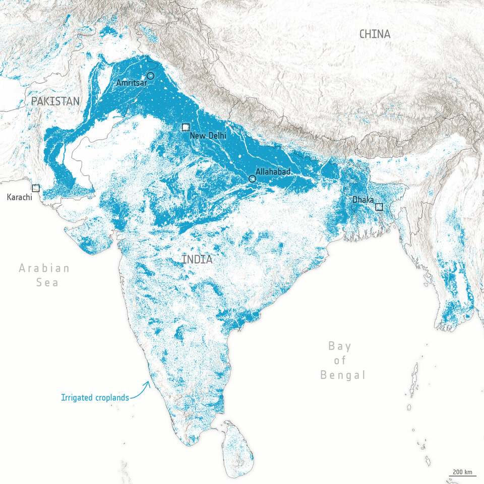 The following figures from ESA, show the land cover classification map of India as well as the extent of irrigation.