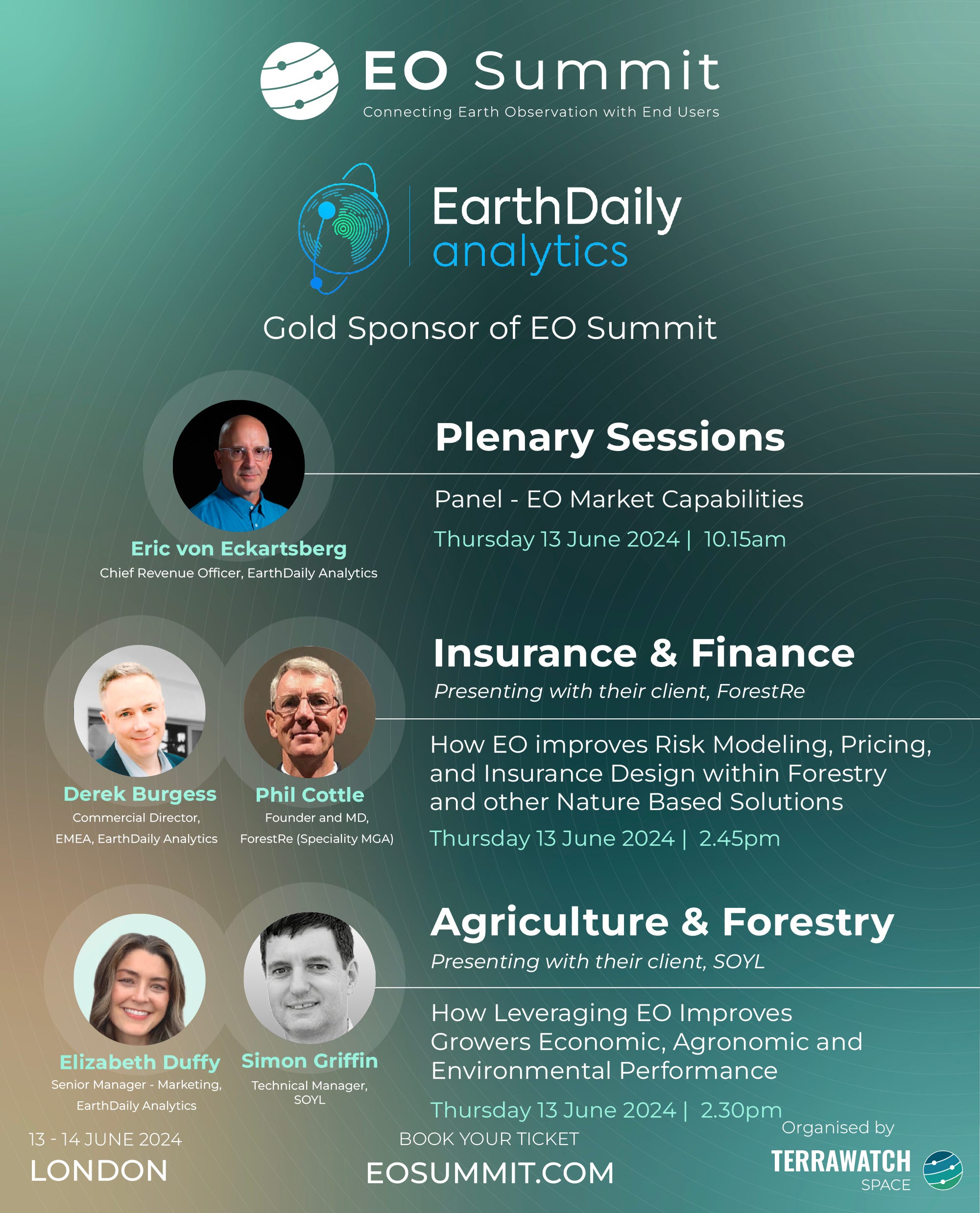 Check out the diversity of organisations, including end-user organisations, analytics firms and EO satellite companies that will be presenting at the EO Summit, focusing on insurance, finance, agriculture, forestry, energy, utilities and climate sectors.