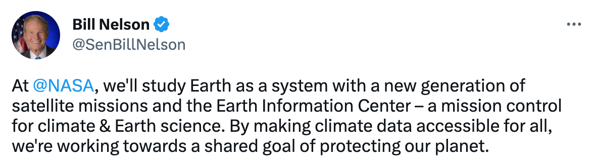 NASA Administrator Bill Nelson tweeted that the agency will be building a new Earth Information Center - a sort of mission control unit for climate and Earth science with an aim to provide easy-to-use information derived from satellites to support decision-making - from temperatures to sea-level rise, emissions to agriculture among many others. This sounds ambitious and if you know much about the lack of useful, usable data products in EO, so certainly substantial.