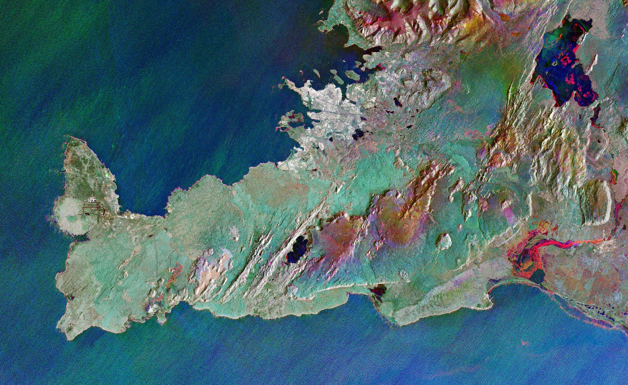 This false-colour image of Iceland's Reykjanes Peninsula, is actually made up of three satellite images over time captured by the Sentinel-1 satellite: red in January, green in February and blue in March. Some highlights: