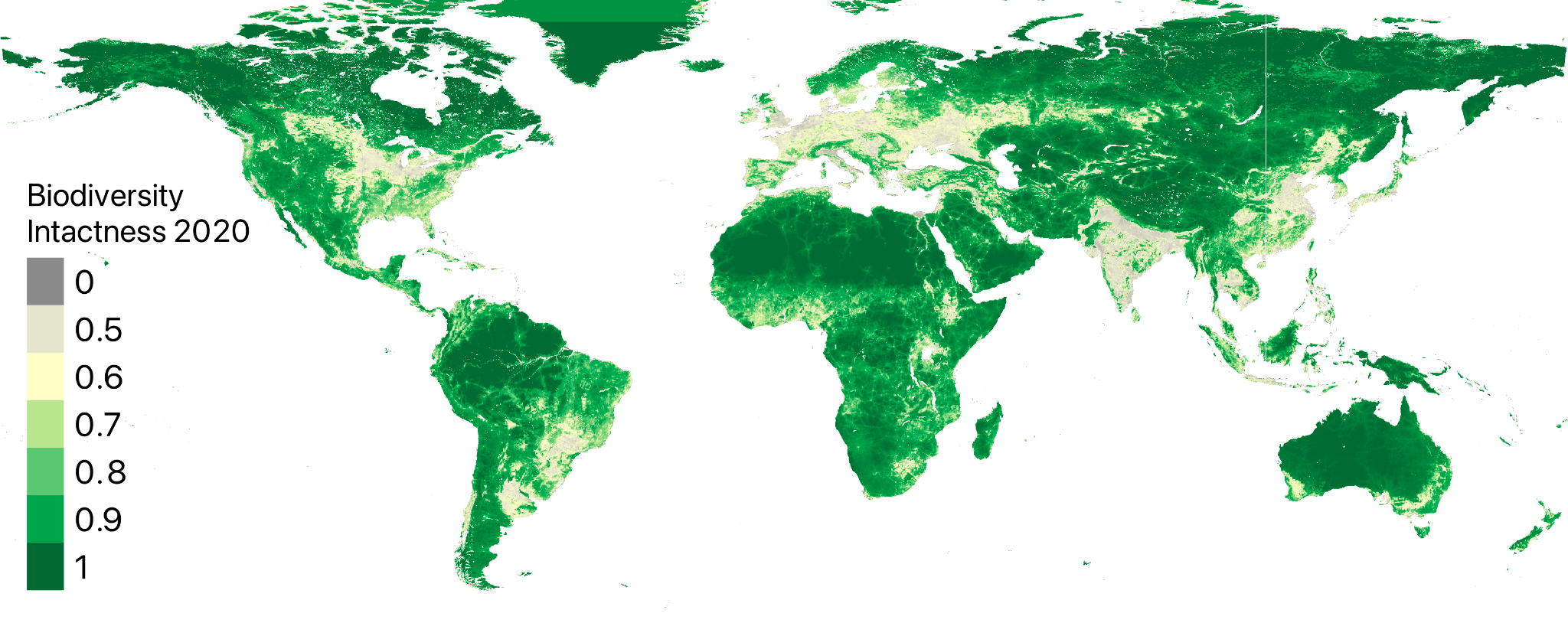 Microsoft’s Planetary Computer integrated a new dataset on biodiversity called Biodiversity Intactness, derived by EO analytics firms Impact Observatory and Vizzuality (sample below, explore more on the link)