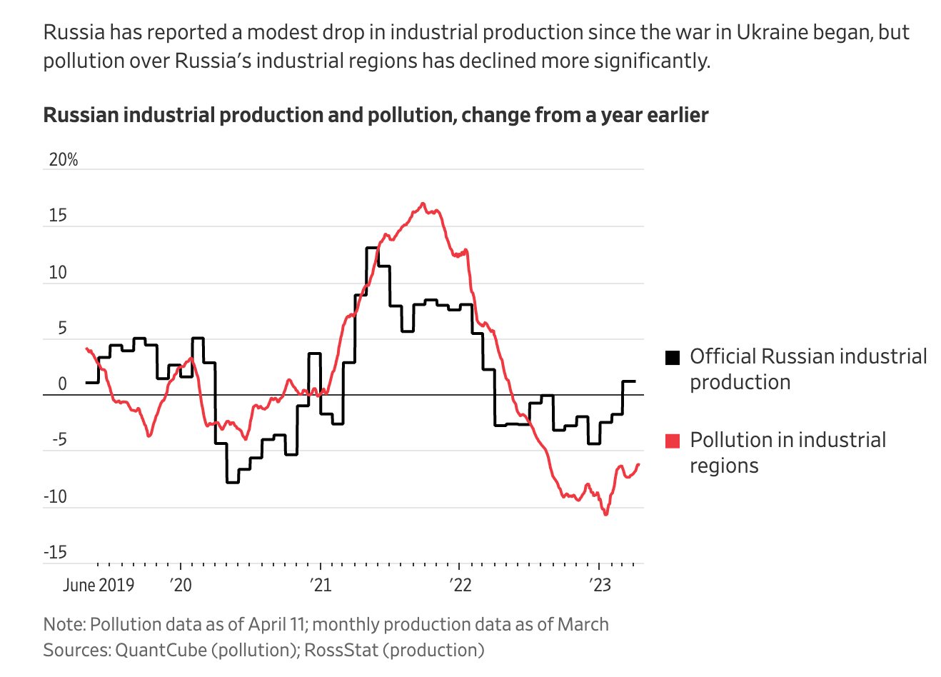 - This piece that looks at pollution data (from Sentinel-5P) to analyse the industrial decline in Russia (by French startup QuantCube);