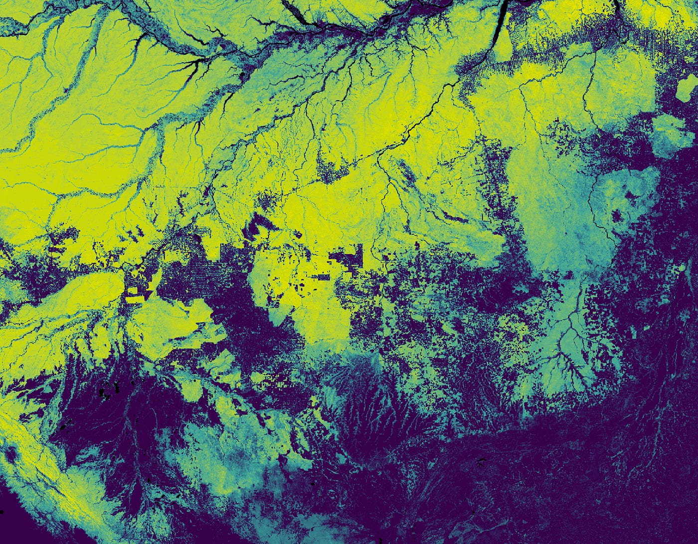 The following image shows a map of aboveground Forest Carbon along the Amazon Rainforest. Yellow represents the highest levels of carbon, green and blue indicate progressively less carbon, while dark purple areas are not forested.