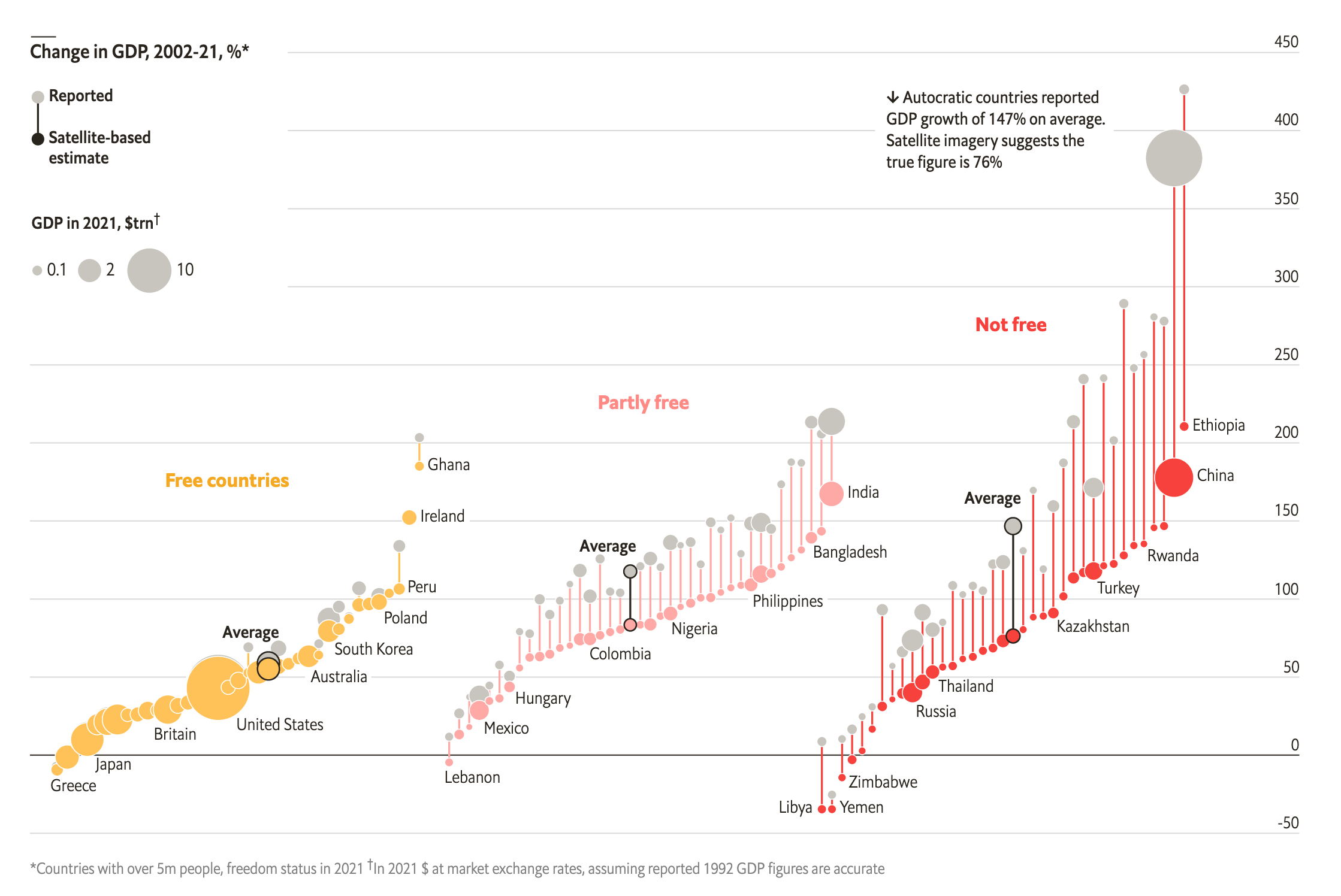 The image below, sourced from the Economist shows how autocratic countries reported more economic growth than actually the case, based on an analysis of the nightlight data from these countries.