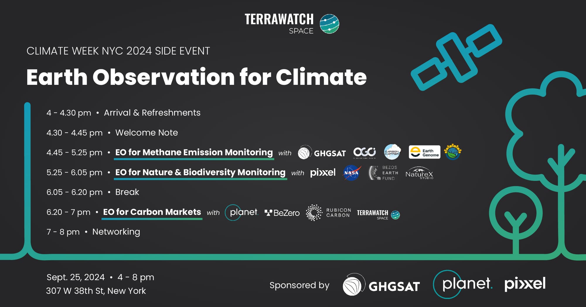 We are organizing a side event focused on EO during Climate Week NYC on Sep 25. There will be three panel discussions on the use of EO across three use cases: GHG Emission Monitoring, Carbon Markets, and Nature & Biodiversity, with an exciting lineup of panelists.