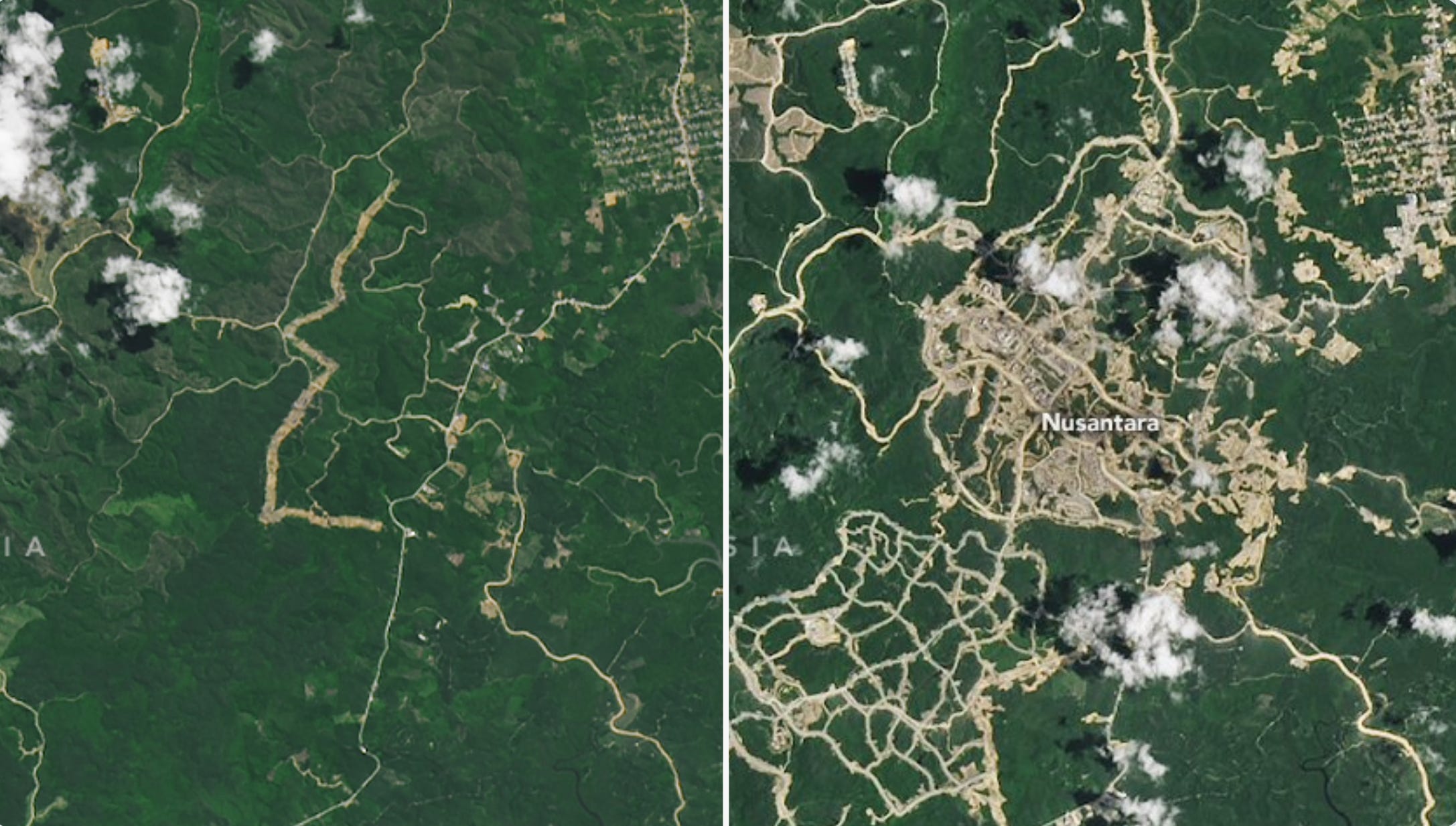 Construction of Nusantara began in July 2022 and since then the landscape has been changing, as the two images from NASA below show. While the plan is to keep 75 per cent of the city forested, some researchers worry about the biodiversity and carbon impacts of land use change. At least we will have all our EO satellites monitoring those impacts until the works are complete in 2045.