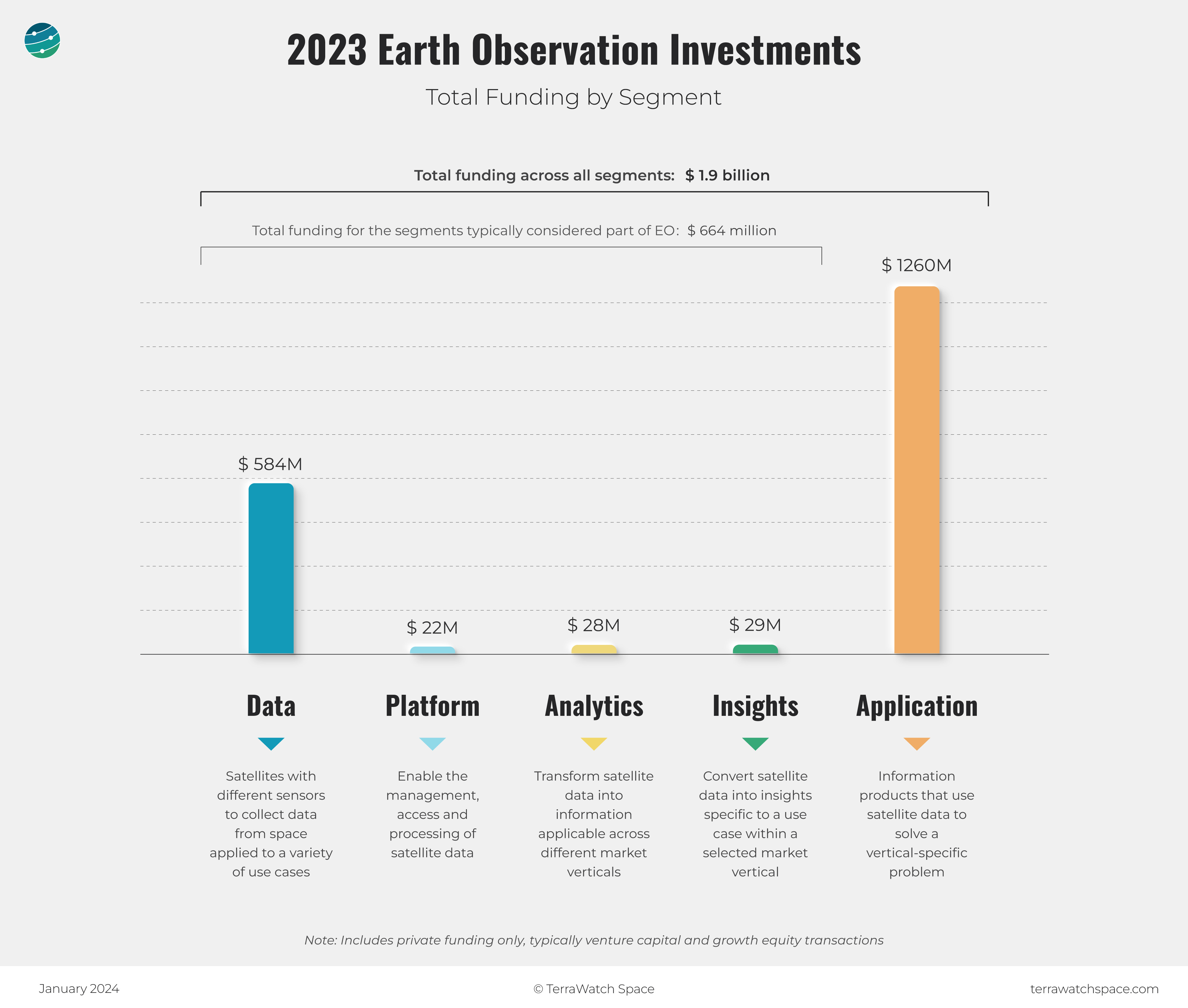 As the figure above - extracted from the TerraWatch 2023 EO Investments analysis - shows, the intermediary Platform and Analytics segments received less than 3 percent of overall funding in the year. That figure was slightly higher at 5 percent for the 2022 investments. Note that this figure may not include the investments in platforms made by companies in the Data segment like Planet, Maxar and Pixxel among others, which have their in-house platform initiatives.